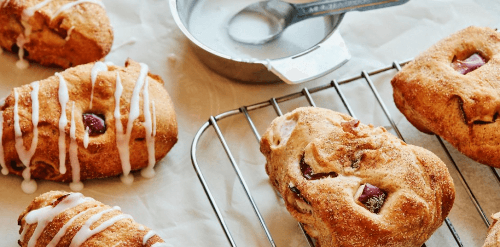 À l’aide d’une cuillère, versez le glaçage en filet sur les beignets chauds. Servez.